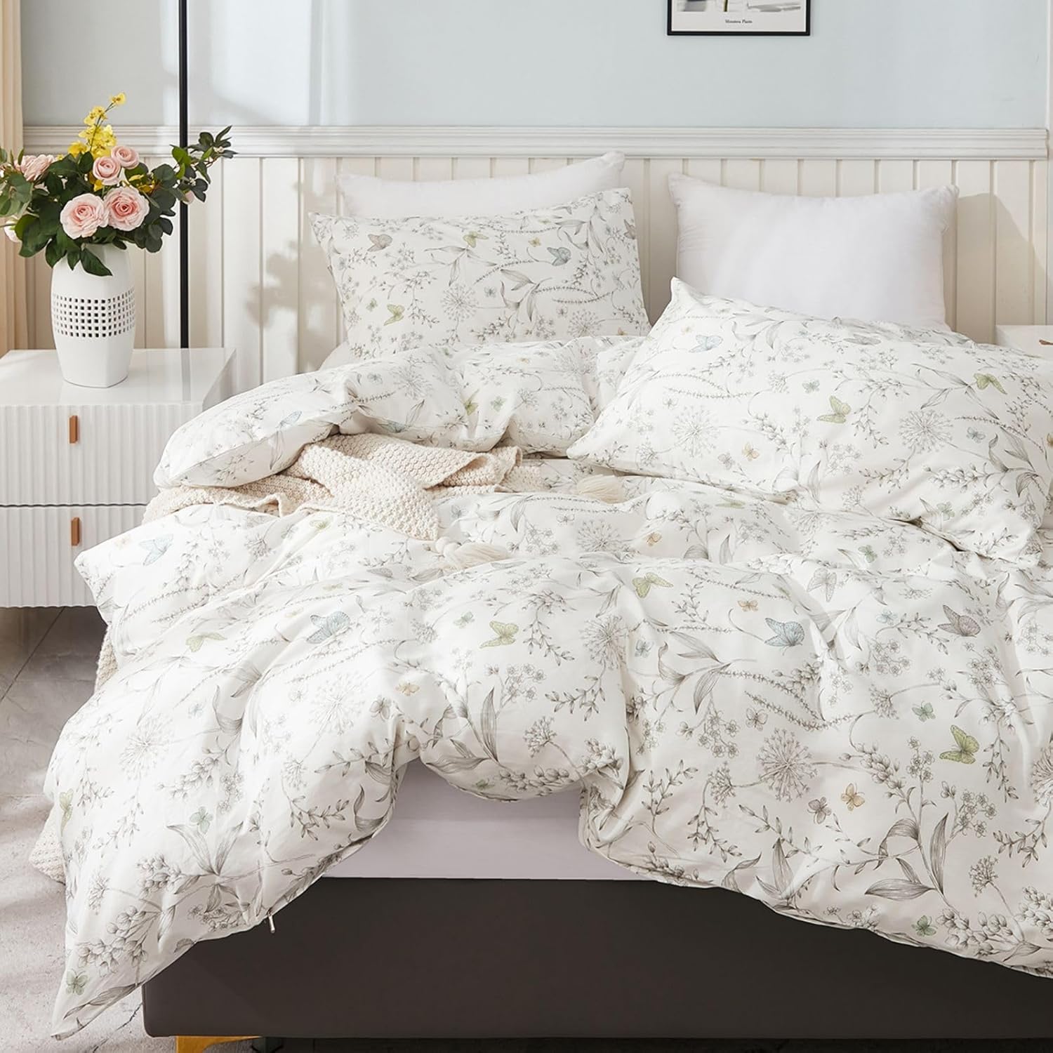 JOLUSERE 100% Cotton Duvet Cover White Floral Duvet Cover Set with Colorful Butterfly Pattern Full Size,Pearl White
