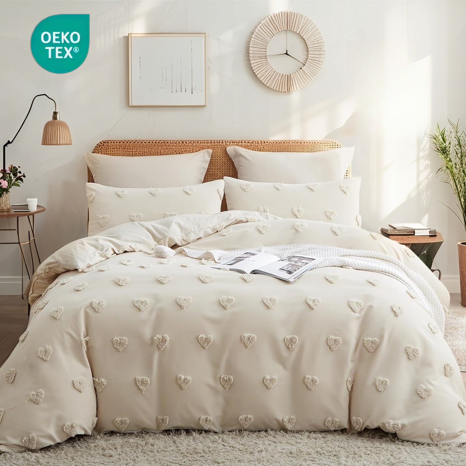 JOLUSERE Beige Tufted Heart Dot Duvet Cover King Set, 3 Pieces Ultra Soft Jacquard Embroidery Shabby Chic Bedding Set for All Season