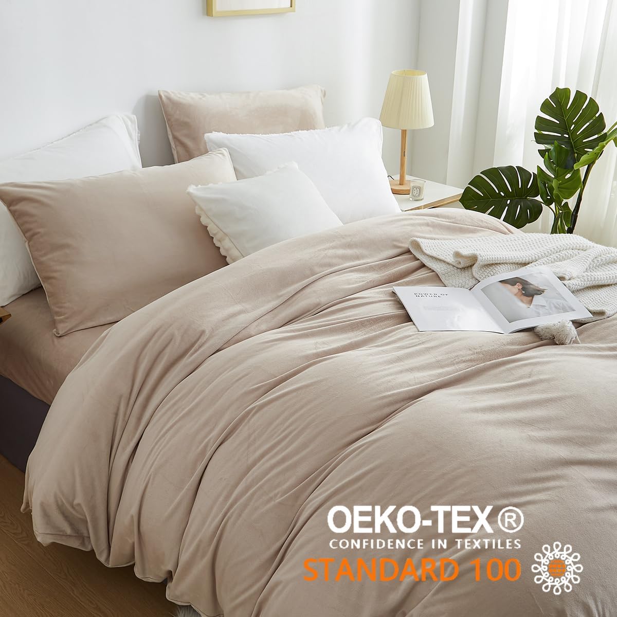 JOLUSERE Oatmeal Beige Velvet Duvet Cover King Set, 3-Piece Ultra Soft Fluffy Flannel Winter Bedding Cover